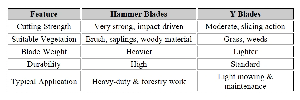 Selecting the correct blade type has a direct impact on cutting performance, efficiency, and operating cost. The table below highlights the key differences between hammer blades and Y blades to help you select the most suitable option for your application.